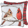 A cotton pillow displaying a charming scene of a male and female cardinal on a snowy branch. Winter cardinals design is replicated from original artwork painted onto burlap canvas, giving the art a unique depth and texture. Pillow features coordinating Christmas plaid pattern on back and piping trim. Our Cardinal Couple pillow includes a zipper to easily remove and clean machine-washable pillow cover.  A Christmas home accent perfect for adding rustic seasonal style to any room.